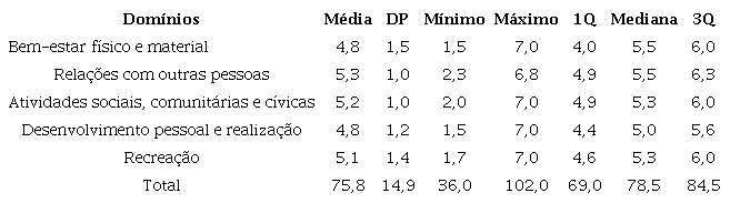 Neste estudo, os domínios com piores resultados foram “bem-estar físico e material” - relacionado à disposição física, conforto e tranquilidade - e “desenvolvimento pessoal e realização”, que expressa autoaceitação, autonomia, senso de domínio, boa relação com os outros e procura por metas(16). As melhores respostas por domínio foram observadas no domínio “relações com outras pessoas”. Esses dados concordam com os achados de um estudo sobre QV de estudantes de Nutrição, que obtiveram melhores resultados também nesse domínio(17).