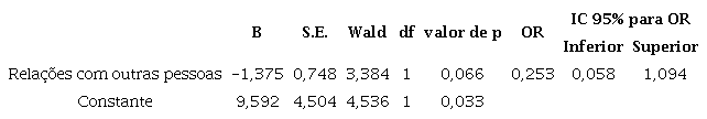 A análise de regressão resultou em um modelo estatisticamente significativo, no qual o domínio “relações com outras pessoas” foi capaz de prever 21,2% da variabilidade da variável estresse [X2(1) p=0,023; R2 Nagelkerke = 0,212]. A QV no domínio “relações com outras pessoas” foi um fator de proteção do estresse (OR = 0,253; IC 95% = 0,058 – 1,094). A chance de estresse em pessoas com boa QV no domínio “relações com outras pessoas” foi 25,3% menor do que em pessoas com ausência dessa condição. Os resultados estão apresentados na Tabela 2.