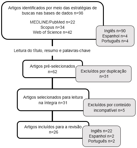Foram encontrados 98 artigos por meio das estratégias de buscas nas bases de dados, sendo 22 na MEDLINE/PubMed, 34 na Scopus e 42 na Web of Science. Após análise e aplicação dos critérios de inclusão e exclusão, foram selecionados 26 artigos para o estudo (Figura 1).