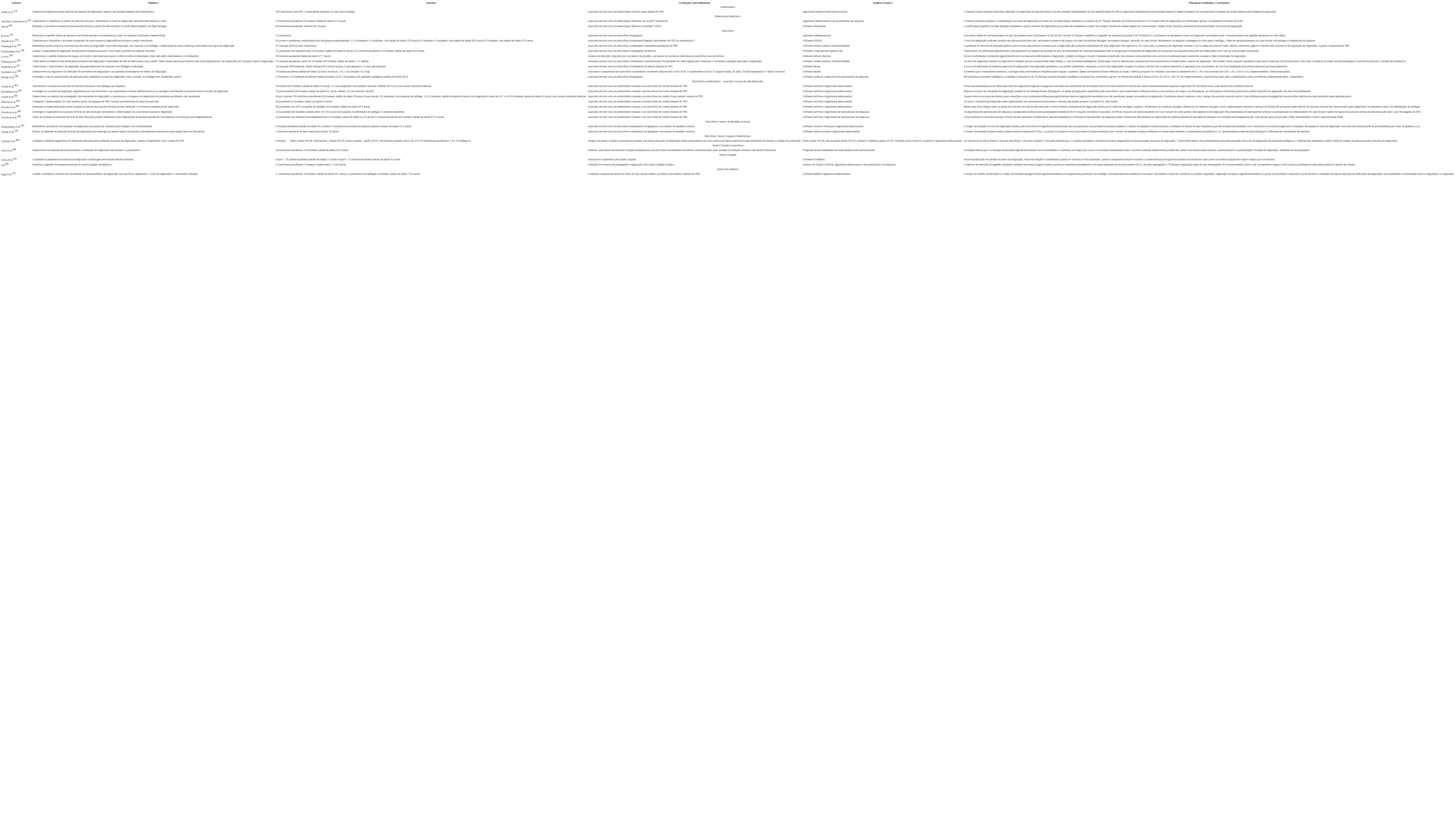 Resultados: Foram encontrados 98 artigos. Após a aplicação dos critérios de seleção, 26 artigos foram selecionados para esta revisão. Para captação dos sinais de ausculta cervical, o microfone foi o instrumento mais utilizado, seguido pela técnica de ausculta cervical de alta resolução, que combina sinais acústicos e vibratórios registrados por um microfone e um acelerômetro, respectivamente. Softwares e/ou algoritmos foram selecionados para análise acústica dos sinais, de acordo com o objetivo de cada estudo.