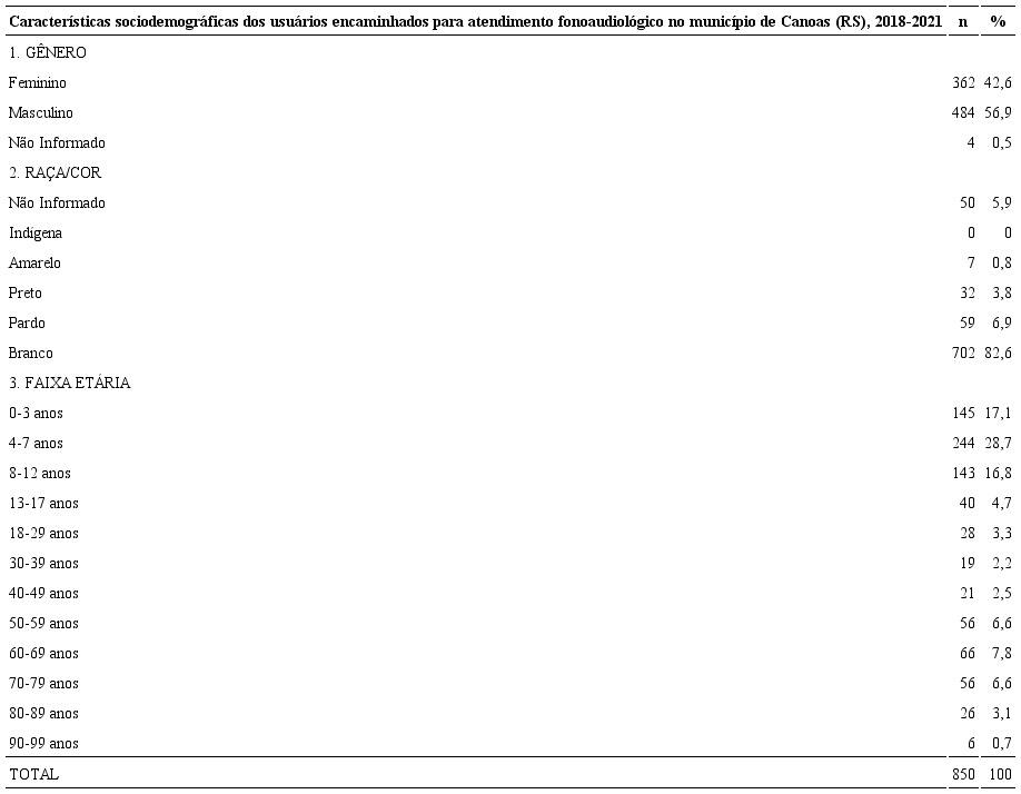 Dentre os usuários referenciados para Fonoaudiologia, 484 (56,9%) eram do gênero masculino. Em relação à raça/cor, 702 usuários (82,6%) se identificaram como brancos, enquanto o restante se identificou nas demais raças. A faixa etária dos indivíduos estendia-se dos 11 meses aos 96 anos, com média de 23 anos. O maior número de encaminhamentos foi de crianças de 4 a 7 anos, apresentando 244 (28,7%). Além disso, 50 usuários (5,9%) não identificaram sua raça/cor no ato do cadastro, percentual que foi maior do que a população autorreferida de 32 usuários pretos (5,8%) (Tabela 1).