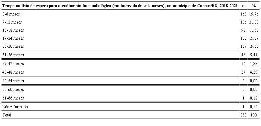 Conclusão: Observou-se um represamento da demanda para atendimento fonoaudiológico pelo Sistema Único de Saúde em Canoas (RS), com baixa rotatividade e tempo de espera longo para reabilitação dos usuários, em sua maioria crianças. A partir deste estudo, espera-se auxiliar na identificação dessa demanda e, assim, possibilitar a criação de políticas públicas de habilitação ou reabilitação no município e melhorar o acesso da população ao atendimento especializado