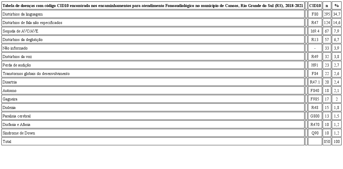 Dentre todos os encaminhamentos, 740 indivíduos (87,1%) apresentaram uma das queixas fonoaudiológicas descritas, a maioria referindo-se à linguagem e fala em 584 indivíduos (60,5%), seguida de deglutição em 115 indivíduos (11,9%) e desenvolvimento neurológico em 59 indivíduos (6,1%). Dentre as doenças que oportunizaram o encaminhamento, o CID10 mais encontrado foi o F80: Distúrbio da linguagem, em 295 indivíduos (34,7%), conforme descrito na Tabela 3.