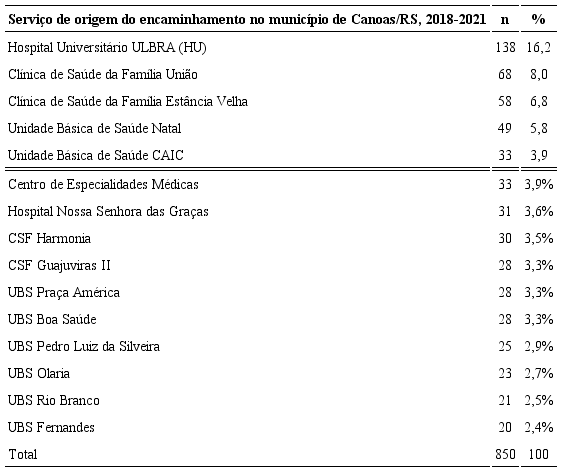 Quanto à origem dos encaminhamentos, observou-se que a Atenção Primária à Saúde totalizou 539 encaminhamentos para a Fonoaudiologia (contabilizando Clínicas de Saúde da Família e Unidades Básicas de Saúde - 76,2%) e apenas 225 encaminhamentos (23,7%) foram advindos da Média e Alta Complexidade (Hospital Universitário ULBRA), Centro de Especialidades Médicas e Hospital Nossa Senhora das Graças (Tabela 4).