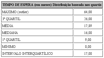 Os resultados quanto ao tempo de espera demonstraram que a amostra não seguiu uma distribuição normal, pois os dados foram bastante variáveis. Dos 850 cadastros analisados, apenas 1 não possuía tempo de espera informado, portanto, os coeficientes de distribuição foram calculados com 849 dados. Destes dados, 50% da amostra, equivalentes a 425 pacientes, estavam com tempo de espera entre 9 e 26 meses, o que se traduz em um intervalo interquartílico de 17 meses. Não obstante, constatou-se, pela distribuição, que havia um outlier, representando um tempo de espera de 64 meses - valor discrepante e muito fora da distribuição. Por último, a média aritmética dos dados foi de, aproximadamente, 18 meses. O Quadro 1 mostra a distribuição baseada nos quartis e traz uma noção ampla do tempo de espera.