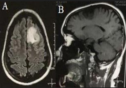 Paciente de 27 anos, gênero masculino, curso superior incompleto, estudante do 8º período do curso de Medicina. Devido a episódio de crise convulsiva tônico-clônica, foi levado ao hospital do município de Belo Horizonte, onde foi submetido à tomografia computadorizada de crânio e, posteriormente, à ressonância magnética de encéfalo (Figura 1), que identificou lesão em topografia do giro frontal superior e médio do lobo frontal à esquerda, com edema e apagamento de sulcos perilesionais, sem desvio de linha média.