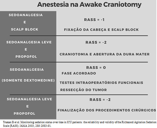 Para a realização do procedimento supracitado, é de suma importância a condução minuciosa da técnica anestésica, a fim de garantir analgesia, sedação, estabilidade hemodinâmica e controle de possíveis intercorrências, como crises convulsivas à manipulação cortical, porém, de modo a não haver prejuízo na avaliação neurológica e linguística intraoperatória do paciente(2,7).