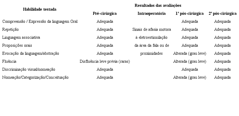 O paciente foi avaliado no pós-operatório imediato com fala fluente e habilidades linguísticas preservadas, porém, com alteração em grau leve de evocação automática da linguagem, no que se refere à representação e ligação entre um significante e um significado, alteração característica de pós-operatório imediato por manipulação cortical e edema pós-cirúrgico(4,6).