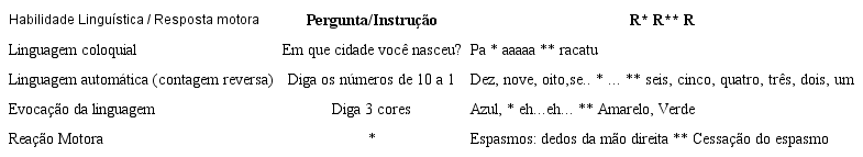 A escolha das tarefas linguísticas para a avaliação do caso descrito neste relato foram baseadas no Teste de Reabilitação das Afasias - Rio de Janeiro(15), por ser um teste com tarefas mais simples, curtas e objetivas, por contemplar as funções linguísticas descritas como necessárias às avaliações pré, intra e pós-operatórias(5,13,14) e por ser um teste desenvolvido para as especificidades brasileiras e padronizado para aplicação em pacientes adultos, testado na faixa etária entre 19 e 80, para nível de escolaridade desde o primário até o superior(15), contemplando, portanto, a faixa etária e o nível de escolaridade do paciente deste estudo de caso.