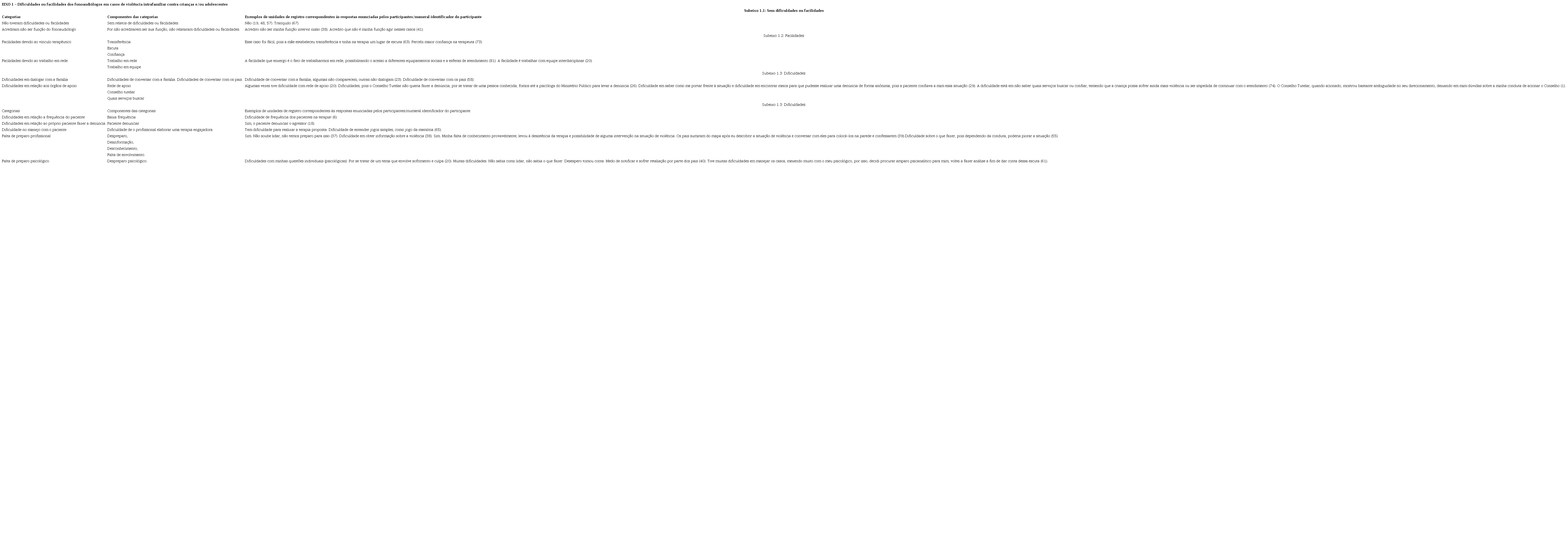 O Eixo 1 referiu-se às dificuldades ou facilidades apresentadas pelos fonoaudiólogos em casos de violência intrafamiliar contra crianças e/ou adolescentes e foi constituído por 3 subeixos: 1.1, cujos profissionais não relataram dificuldades ou facilidades; 1.2, as facilidades elencadas pelos fonoaudiólogos e 1.3, as dificuldades encontradas.