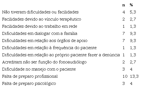 Dos 75 pesquisados, 39 (52%) atenderam crianças e/ou adolescentes com casos suspeitos ou confirmados de violência. O público mais acometido pela violência foram as crianças entre 2 e 12 anos (48%), seguidas de adolescentes (32%) e bebês (13,3%). Os tipos de violência encontrados foram a violência psicológica (41,3%), violência física (38,7%), violência sexual (36%) e negligência e abandono (26,7%). As dificuldades ou facilidades relatadas pelos fonoaudiólogos que atenderam casos de violência familiar contra crianças e/ou adolescentes estão descritas na Tabela 1.
