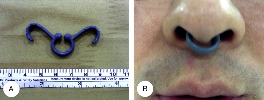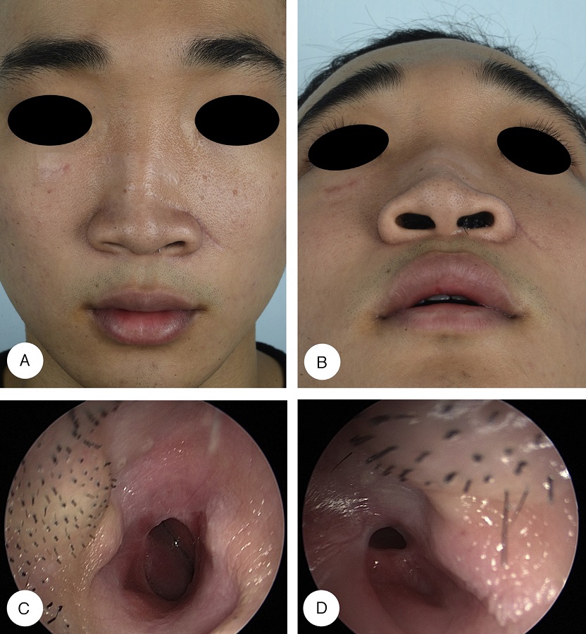 Nasal vestibular stenosis is not only an esthetic, but also a functional problem for the patient.1 It is caused by disruption of the nasal vestibular lining with secondary proliferation of granulation and fibrous tissue.1,2 Various causes account for the development of nasal vestibular stenosis, including trauma, infection, and iatrogenic injury to the vestibular skin. Although a number of techniques have been described for repairing vestibular stenosis,2-4 correction may be difficult because of the tendency to wound contracture and recurrence. Herein, we describe a rare clinical presentation of nasal vestibular stenosis after maxillofacial surgery, which was successfully treated with endoscopic lysis of synechiae, release of vestibular scarring, and nasal stenting. This study was approved by the institutional review board of Pusan National University Hospital.