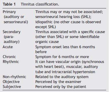 Patients with tinnitus usually report worsening in silent environments. Exposure to noise may be the temporary worsening factor for tinnitus; for instance, in the tonic tensor tympani syndrome and in the semicircular canal dehiscence.21 Studies on foods that interfere with tinnitus are scarce. Fish consumption one or more times a week and dairy restriction seem to reduce persistent tinnitus.22 Hearing loss is an important risk factor, as well as exposure to noise, hyperlipidemia, asthma, osteoarthritis, rheumatoid arthritis and thyroid diseases23 and systemic arterial hypertension.24