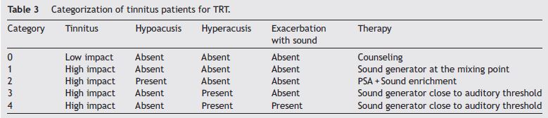 - Habituation: physiological process characterized by the progressive decline of responses to the same stimulus. The concomitant use of sound therapy may be necessary, for it promotes the constant input of sounds, either through sound generators, hearing aid amplification prostheses or environmental sounds. Habituation occurs if the stimulus is neutral, that is, free of associations and/or connotations with negative emotional states. Patients with hyperacusis, associated or not with tinnitus, are also candidates for treatment with TRT. Table 3 summarizes the proposals and modalities of TRT treatment according to patient groups. The efficacy of habituation therapy is around 84-86%, and may vary according to patient adherence to treatment. 107,108