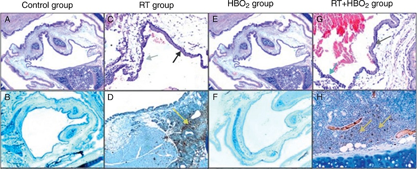 Thirty-two Wistar Albino rats were divided into four groups. The control group (n = 8) was given no treatment during the study period. The HBO2 treatment group (HBO2) (n = 8) was given only HBO2 throughout the study. The Radiotherapy (RT) group (n = 8) was given only RT throughout the study. The RT plus HBO2 group (RT + HBO2) (n = 8) was given both RT and HBO2 on the same day.