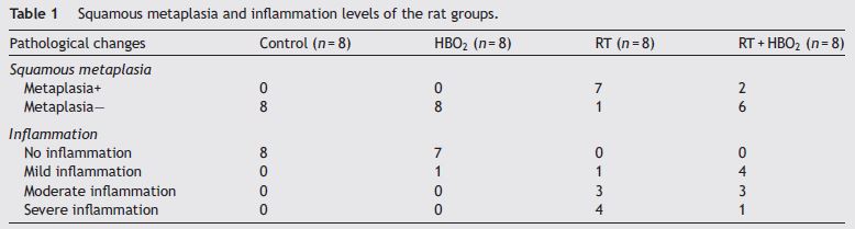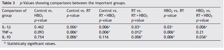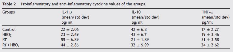 Results: Histopathological and biochemical evaluations of specimens were performed. Serum tumor necrosis factor-α, interleukin-1β, and tissue inflammation levels were significantly higher in the radiotherapy group than in the radiotherapy plus hyperbaric oxygen group, whereas interleukin-10 was higher in the radiotherapy plus hyperbaric oxygen group.