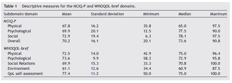 The values found for each domain were higher than those described for quality of life in the overall population by Cruz et al. (2011).1 On the other hand, approximate scores were described in a Brazilian study evaluating quality of life in CI users using this same tool.13