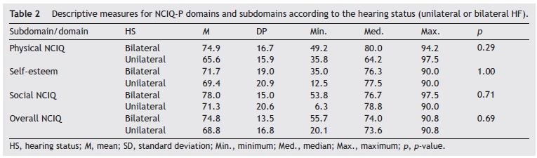 In the present study, the domains with the highest scores in the NCIQ-P specific questionnaire were, respectively social, psychological, and physical domains, with very similar scores for the psychological and physical domains (Table 1). These results corroborate the data shown in literature, in which the social domain represents the best assessed aspect related to quality of life by the adult population using CI.3,4,9-12 The study that translated and adapted this tool into Brazilian Portuguese found similar scores for all domains, with the social domain also being the best scored aspect among the study participants.4