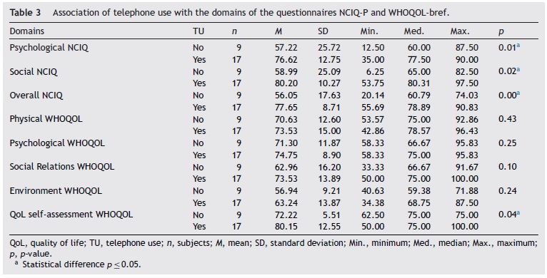 The variable telephone use was defined based on NCIQ Question 60 scores: patients with a score <50 were classified as "no" and the others were classified as "yes". The non-parametric Wilcoxon test was used to associate telephone use with the domain scores of both questionnaires.