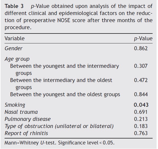 Results: Statistically significant improvement in the preoperative NOSE questionnaire compared to the scores obtained three months after surgery was demonstrated (p < 0.001, T-Wilcoxon), with strong correlation between the preoperative score and the postoperative improvement during this period (r = −0.614, p < 0.001, Spearman). After one month, patients reached in average 87.15% of the result obtained at the study termination. Smokers and patients with rhinitis and/or pulmonary comorbidity showed increased average preoperative NOSE scores, although without statistical significance (p > 0.05). Gender, age, history of rhinitis and presence of pulmonary comorbidity did not influence significantly surgical outcomes (p > 0.05). Smokers presented greater reduction in NOSE scores during the study (p = 0.043, U-Mann-Whitney).