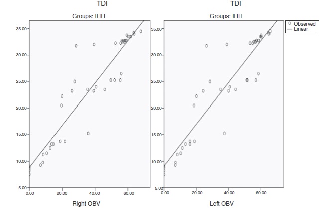The OBV of both sides was found to be significantly correlated with TDI scores in IHH patients (right OBV-TDI, r: 0.934, p < 0.001; left OBV-TDI, r: 0.928, p < 0.001) (Table 4) (Figs. 1 and 2). Serum indicators of hypogonadism, such as FSH, LH, serum free testosterone, serum total testosterone, and TDI correlation, were investigated; no significant correlations were found.