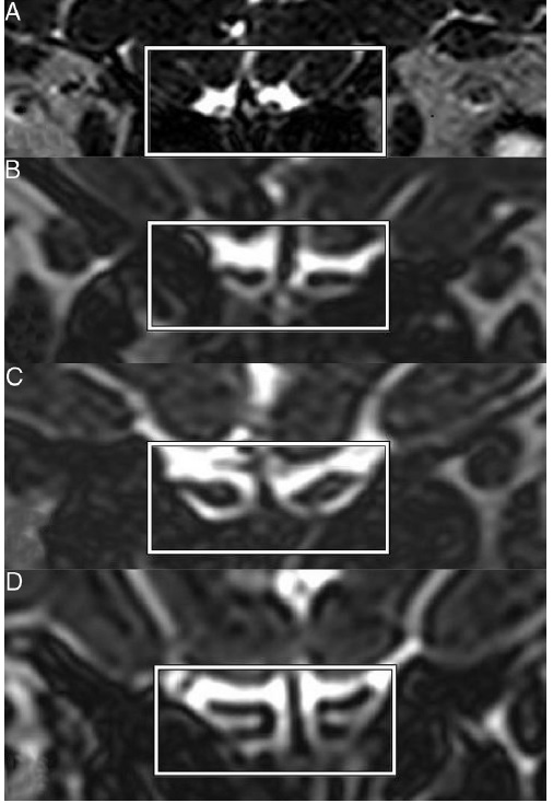 Examinations were performed using a 1.5 T magnetic resonance imaging (MRI) system (Avanto; Siemens, Erlangen, Germany) with a 12 channel head coil. Sections were angulated perpendicularly to the anterior base of the skull or cribriform plate. We used three-dimensional T2 sampling perfection with application of optimized contrast using different flip angle evolutions (SPACE) covering the anterior and middle segments of the base of the skull. Parameters of the three-dimensional T2 SPACE sequence were as follows: echo time, 224 ms; repetition time, 1440 ms; bandwidth, 349 Hz per pixel; field of view, 190 × 190; matrix, 520 × 512; slice thickness, 1 mm; no interslice gap.
