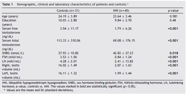 Our study included 31 controls and 45 IHH patients. The groups did not differ significantly in terms of age, sex, or education level. As expected, the IHH patients had lower levels of serum free testosterone, total serum testosterone, FSH, LH, and lower right and left testis volumes (Table 1).