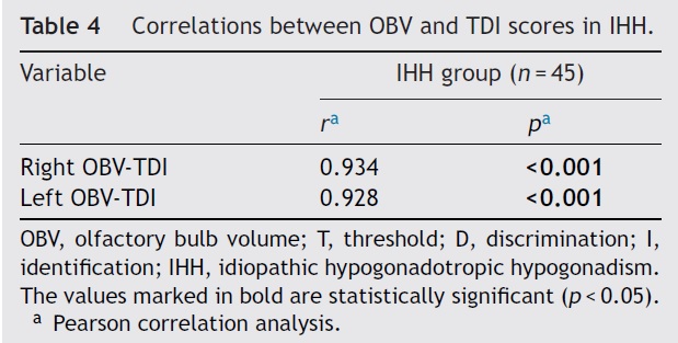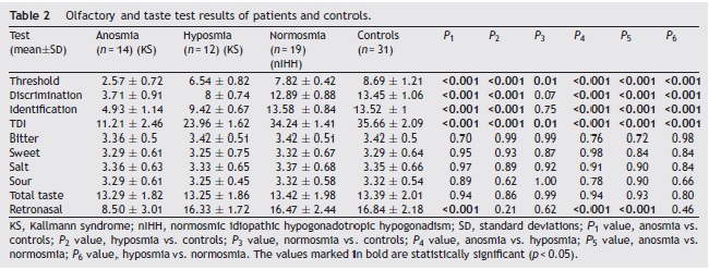 Results: Discrimination, identification and threshold scores of patients with Kallmann syndrome were significantly lower than controls. Threshold scores of patients with normosmic idiopathic hypogonadotrophic hypogonadism. were significantly lower than those of controls, but discrimination and identification scores were not significantly different. Retronasal olfaction was reduced only in the anosmic idiopathic hypogonadotrophic hypogonadism group compared to controls. Identification of bitter, sweet, sour, and salty tastes was not significantly different when compared between the anosmic, hyposmic, and normosmic idiopathic hypogonadotrophic hypogonadism groups and controls. Olfactory bulb volume was lower bilaterally in all patient groups when compared with controls. The olfactory bulb volume of both sides was found to be significantly correlated with threshold, discrimination and identification scores in idiopathic hypogonadotrophic hypogonadism patients.