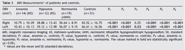 Olfactory bulbs were not seen in four patients in the anosmic group. OBV was lower bilaterally in all patient groups when compared with controls. However, the right OBV was not statistically different between the normosmic IHH group and the control group (Table 3).