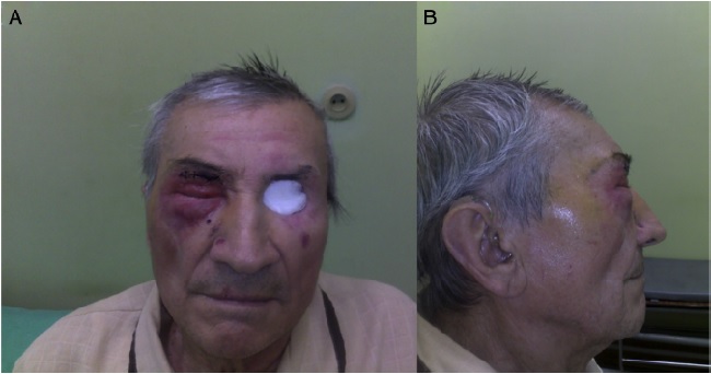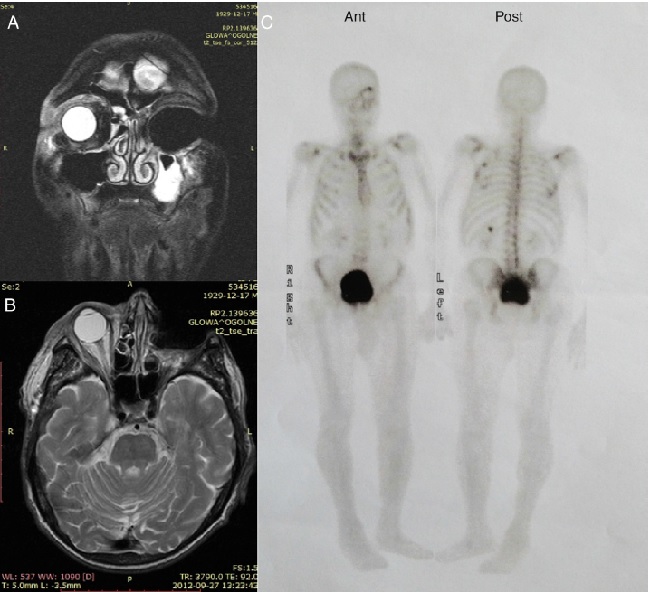 An 80 years old man was referred to the ophthalmology department with an inflammation of the left lower eyelid that had developed at the beginning of 2009. A computed tomography (CT) without contrast enhancement showed increased thickness of the upper and lower eyelids up to 7-10 mm with abnormal soft tissue mass in the upper-medial part of the left orbit. For two months the patient had experienced a slowly growing tumor and infiltration of the left lower eyelid. The skin of the involved area seemed erythematous and asymptomatic. A biopsy of the thickened area showed a benign process with fibroblasts cells infiltration. Chest X-ray and abdominal ultrasound were normal. A standard local and oral anti-inflammatory treatment with prednizone 20 mg daily and dexamethasone eye drops two times daily was prescribed. During the two months, the patient had experienced a slowly growing tumor and infiltration of the left lower eyelid. The skin of the involved area appeared erythematous and asymptomatic. An open biopsy was then performed, showing a benign process-neuronaevus. In the following two months, the left lower eyelid showed increased diffuse thickening. A control CT presented thickness of the left lower eyelid of 7 mm and abnormal, and 15-10 mm of soft tissue in the left orbit at the same location as the previous CT. A complete excision of the left lower eyelid with reconstruction was done. Histopathological examination under microscope determined that there were cords of neoplastic cells, which were found between muscle fibers. The tumor cells had small vacuoles within the cytoplasm. There was mild pleomorphism of cell nuclei; in some nuclei, vesicles were observed. The tumor cells were positive for cytokeratins and S-100 protein and negative for synaptophysin. GFAP immunostaging gave artificial results. Morphology and clinical data were consistent with diagnosis of histiocytoid eccrine carcinoma (Fig. 1). The patient was admitted for oncologic treatment. 45 Gy of intensity-modulated radiation therapy (IMRT) were administered. Several weeks after radiotherapy, it was observed an increased diffuse thickening of the upper and lower eyelids and the ptosis. Magnetic resonance imaging (MRI) and CT showed infiltration of both eyelids and orbit with extraocular muscles involvement. A second large biopsy was done. The histopathology examination revealed histiocytoid eccrine carcinoma (Fig. 1). Orbital exenteration and wide excision was performed at the Department of Otolaryngology and Laryngological Oncology. A follow-up with positron emission tomography (PET/CT) scan, MRI, and bone scintigraphy showed no recurrences (Fig. 2). After 24 months of initial treatment, the patient started to suffer from inflammation and edema on the right eyelid (Fig. 3). CT and MRI of the right orbit showed increased thickness of the upper and lower eyelids with orbital involvement. A biopsy of the eyelids showed the same type of pathology previously diagnosed in the left eye (histiocytoid eccrine carcinoma; Fig. 1). The patient was admitted for oncologic treatment. An E9MeV, 45 Gy radiotherapy was administered. Two years later, the patient is alive without evidence of recurrence or metastatic disease.