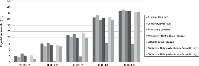 There was no significant decrease in SNR values on the eighth day in the groups that received cisplatin with whortleberry extract (p > 0.05). These results show that whortleberry extract has a protective effect against cisplatin-induced ototoxicity. However, there was no significant difference between the groups treated with cisplatin + 100 mg/kg whortleberry extract and cisplatin + 200 mg/kg whortleberry extract in terms of hearing protection (p > 0.05).