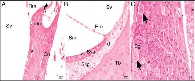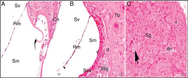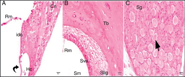 The light microscopic evaluation of the cisplatin group revealed that the general structure of the tissue had deteriorated. Increased cytoplasmic vacuolization and degenerative cell separation was observed. Although the organ of Corti had maintained its integrity, the extension and cell body of the inner and outer hair cells showed local swelling and degenerative separation. The cells' nuclei were observed to be slightly acidophilic, and their cytoplasm showed vacuolization. The tectorial membrane was thickened with normal morphology, whereas Reissner's membrane showed swollen cells and cellular separation. Although the nuclei of the supporting cells were slightly basophilic, a small amount of vacuolization was observed in their cytoplasm. Vacuolization in the spiral limbus region showed separations as dilatation (Fig. 3A). Cells forming the stria vascularis and spiral ligament were pathologic compared with the control group in terms of the array and nucleus view. Dilatations and loss of nucleus due to cell degeneration were detected. Increased vacuolization and some degree of degenerated cells were seen at the stria vascularis and spiral ligament. There were dilated cells in the spiral limb, and they were intensely acidophilic (Fig. 3B). The spiral ganglion and cochlear nerve fibers were somewhat degenerated. Increased vacuolization and axonal degeneration were identified. Deformation of cell bodies was seen in pseudounipolar neurons with a small amount of vacuolization (Fig. 3C).