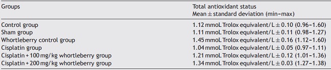 The TOS data of the groups are summarized in Table 2. The TOS values of the cisplatin group (p = 0.001) and the cisplatin + 100 mg whortleberry group (p = 0.015) were significantly higher than those of the control group (p < 0.05). There was no significant difference between the other groups and the control group (p > 0.05).