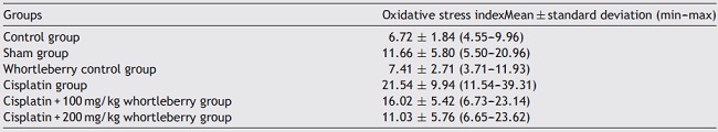 The calculated OSI values of the groups are summarized in Table 3. The OSI value of the cisplatin group (p < 0.001) and the cisplatin + 100 mg whortleberry group (p = 0.031) were significantly higher than those of the control group. There was no significant difference between the other groups and the control group (p > 0.05).
