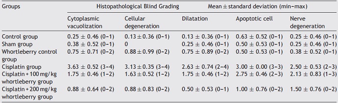 The results of the histopathological blind grading of the groups according to the dilatation, apoptotic cell, nerve degeneration, cellular degeneration, and cytoplasmic vacuolization findings are summarized in Table 4. According to the histopathological blind grading results, no significant difference was observed between the control group and the sham and the whortleberry control groups in terms of degeneration findings (p > 0.05). When the control group was compared with the cisplatin and the cisplatin + 100 mg/kg whortleberry groups, there were significant differences in terms of all evaluation criteria (p < 0.001).
