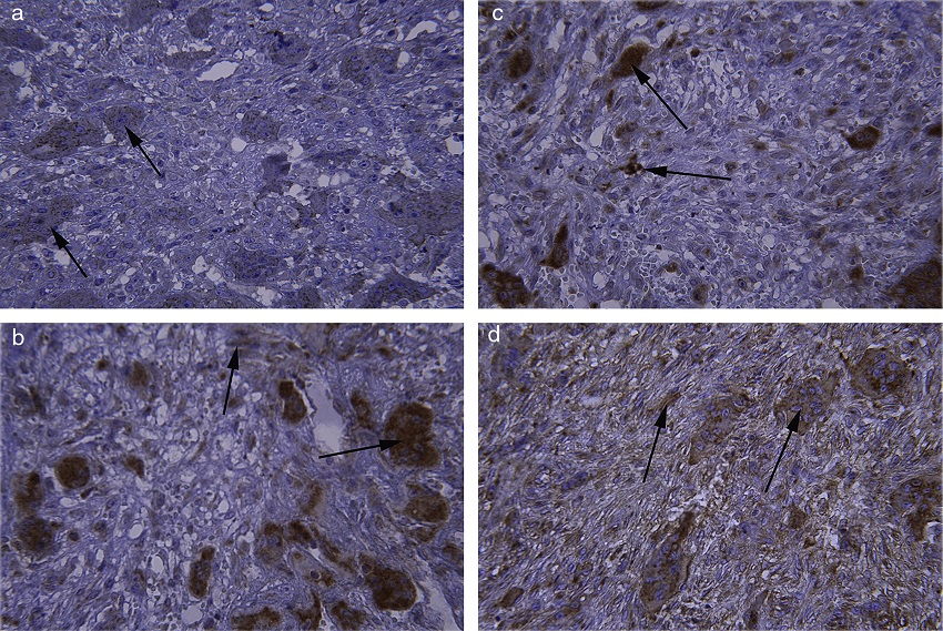 In this retrospective study following approval of the local Ethics Committee (910127) a total of 74 cases included 37 PGCG and 37 cases of CGCG were evaluated immunohistochemically for osteopontin and MMP-2 protein expression.