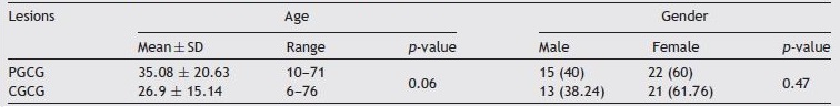 In this study, 37 PGCG and 37 CGCG cases were examined. Demographic data of the subjects are separately shown in Table 1. The mean age of PGCG cases was 35.08 ± 20.63, and in CGCG it was 26.9 ± 15.14, but this difference was not statistically significant (p = 0.06; Independent sample t-test). Also, about 60% of cases in both PGCG and CGCG occurred in females, but the difference between the two groups was not statistically significant (p = 0.47; Chi-Square Test).