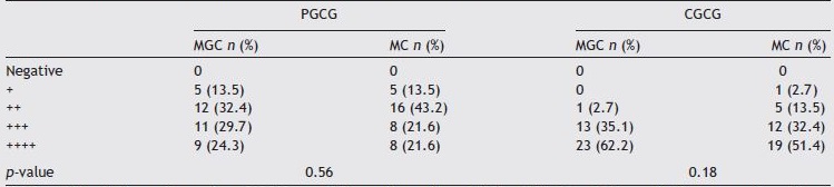 Table 5 shows the staining intensity of giant cells and mononuclear cells for MMP-2 in the lesions. MMP-2 staining intensity between multinuclear and mononuclear giant cells in CGCG (p = 0.39) and between multinuclear and mononuclear giant cells in PGCG (p = 0.34) was not significant.