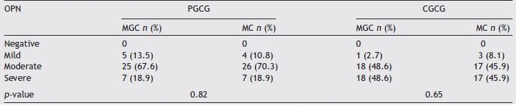 Also Spearman's rank correlation coefficient showed a significant correlation between osteopontin and MMP-2 in both PGCG (p = 0.004, r = 0.332) and CGCG (p = 0.019, r = 0.273).