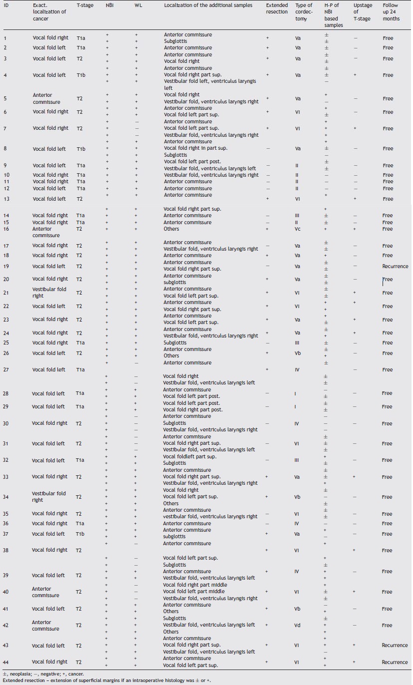 In 5 women and 39 men, aged 54-83 years, superficial mucosa specimens were collected preoperatively and SCC was histologically confirmed. Rigid endoscopy, flexible video-endoscopy (video processor with integrated LED light source, model CV-170 with HD, ENF-VH, Olympus Corp, Tokyo, Japan) with (WL), NBI and a preoperative computer tomography scans were used to assess the larynx. Patients were classified as follows: 14/44 (31.8%) had T1a, 3/44 (6.8%) T1b, 27/44 (61.4%) had T2 cancer; all were staged N0 and M0.