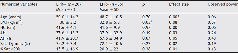Regarding the clinical and polysomnographic parameters evaluated in our study, it was observed that BMI was higher, with statistical significance, in the group of patients with laryngopharyngeal reflux, at the same time being a predictor of the presence of reflux in patients with obstructive sleep apnea, disclosing data similar to those found by Xavier et al.,7 who found that the prevalence of laryngopharyngeal reflux was significantly higher in obese patients (BMI > 30 kg/m2) and that the significant difference in inflammatory signs suggestive of reflux between obese and non-obese subjects suggests that obesity may interfere with inflammatory findings in the pharynx and larynx.
