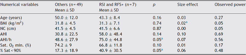 In the group of patients who had positive RSI and RFS (12.5%), concomitantly, there was a trend toward significance (p = 0.05 - Mann-Whitney test) for higher apnea and hypopnea index and higher percentage of sleep time with oxyhemoglobin saturation <90% (Table 3). There were no differences regarding gender when comparing the groups.