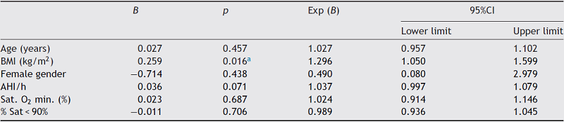 The logistic regression showed that BMI was a predictor factor for the presence of laryngopharyngeal reflux (considering the positive RSI or RFS criterion) (Table 3) in patients with moderate to severe obstructive sleep apnea syndrome, with an increase in the risk having reflux being about 30% higher in patients with an increase in BMI (95% CI: 1.050-1.599). However, no predictors were identified when evaluating the presence of laryngopharyngeal reflux according to the criteria of both positive RSI and RFS tools (Table 4).