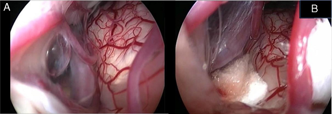 Again, by using the microscope the offending arterial vessel(s) is gently separated from the facial nerve. Sometimes, immediately after facial nerve detachment, a "releasing" trail of electrical stimuli may be noticed on the facial nerve monitoring, which confirms the decompression success.17 Teflon® sponges are the interposed between all offending vessel(s) in order to prevent a new neurovascular contact and to insulate the facial nerve (Fig. 2B). If a vein impinges the facial nerve, after vessel detachment, it is carefully coagulated with bipolar forceps. At the end of the decompression procedure, the proper positioning of the teflon is checked with the endoscope. The cottonoids are removed and the CPA filled with saline solution, then the dura is sutured by single re-absorbable stitches to ensure a water proof resistance. Additional connective tissue is placed and fixed by tissuecole. Bone patè, obtained with bone dust (collected during cranial drilling) fixed by fibrin glue, is used to close the craniotomy site. The muscle-periosteal and cutaneous flaps are carefully sutured in layers with single absorbable stitches. A compressive bandage is applied and kept for 4 days. The patient is awoken from general anesthesia, extubated, lead to the postoperative room for a 3 h observation and then returned to the general ward. The patient permanence is 1 week in the hospital. Patients are followed-up periodically for 2 years after surgery.