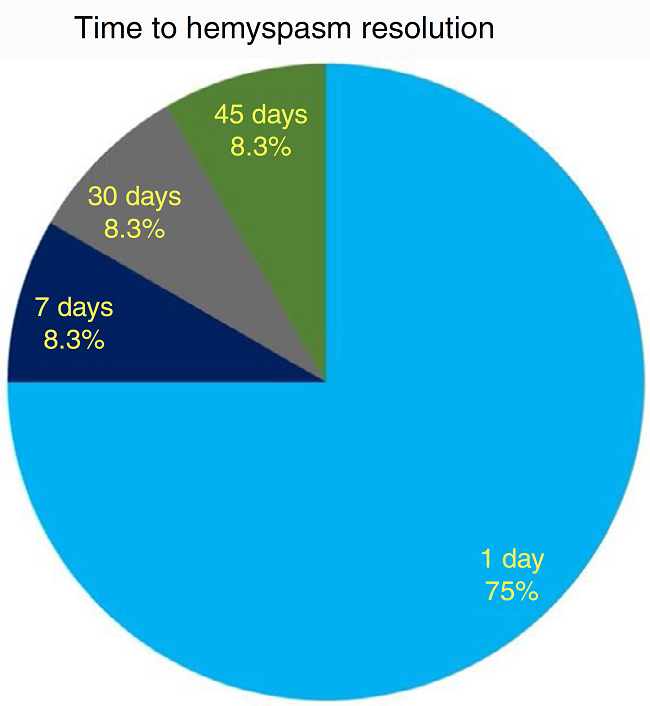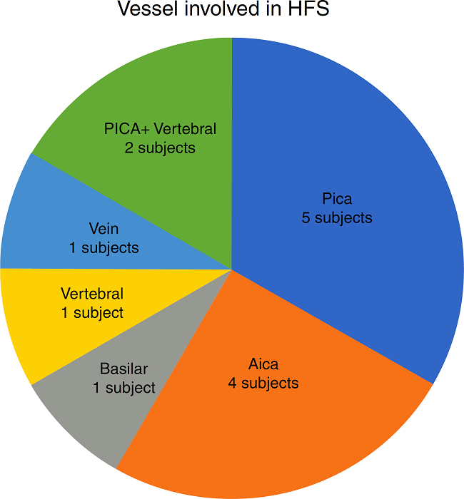As to functional outcome, we noticed HFS resolution within 24 h after surgery in 9/12 (75%) cases, while all patients resolved their HFS within 45 days (Fig. 5). No correlation between HFS resolution timing and the offending vessel (PICA, AICA or vertebral artery) was found (CS, p = 0.7).