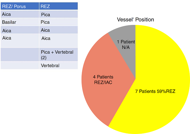 In our study, all patients (100% of cases) presented a correlation between diagnosis and surgical finding.Among our patients, we observed a predominance of left side NVCs (8/12 subjects) with a more frequent involvement (51% vs. 25%) of the posterior-inferior cerebellar artery (PICA) than the anterior-inferior cerebellar artery (AICA). In 2 cases a multiple PICA-vertebral artery impingement on the facial nerve was noticed. The basilar and the vertebral arteries were responsible for the MVC in 1 case each (Fig. 3). An arterial loop impinging the facial nerve was found jutting into the entry of acoustic porous in 33% (4/12 patients) of cases and, involving REZ area only, in 69% (7/12) of subjects (Fig. 4), with significant statistically result (p < 0.05). Only one patient affected from HFS with negative MRI for MVC, we identified a vein crossing the facial nerve. The vein was intracanalicular and in contact with pons. Our patients reported a previous clinical history of HFS average presence of 10 years (SD = 7.1; 95% CI 2-29) at the moment of surgery and 66% of them had undergone previous BoTN treatment.