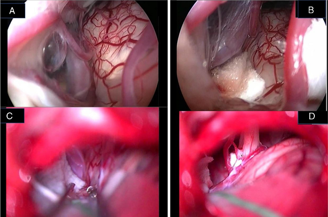 Jannetta in 197712 described the principles of MVD that consists in detaching the offending vascular loop(s) and securing them with a nonabsorbent synthetic sponge with no intentional trauma or disruption of the nerve; after his description a dramatic improvement in surgical outcomes has been reported in the literature. However, this procedure is not without limitations, since several reports have documented failures, recurrences, and complications related to microscopic decompression.7-14 Microscope-assisted vascular decompression for HFS is reported to have a mortality rate of 0.2% and an overall complication rate of 5-25% for temporary dysfunction and 2-10% for permanent neurologic impairment.7-14 Most complications involve auditory or facial nerve function. The reported rate of auditory nerve impairment is 3-5% for temporary dysfunction and 2-3% for permanent hearing loss.7-14,23 Facial nerve impairment occurs temporarily in approximately 4% of patients, whereas 1-2% show permanent facial nerve deficit.7-14 The key for a successful decompression surgery in case of HFS includes a precise visualization of all nerve-vessel conflicts and a confirmation of complete nerve decompression at the end of the procedure (Fig. 7A-D). As already reported by Jannetta, the anatomy of the posterior fossa and the limited size of the craniotomy make an adequate visualization of all the facial nerve course and the porus portion difficult by the microscope use only.12-14