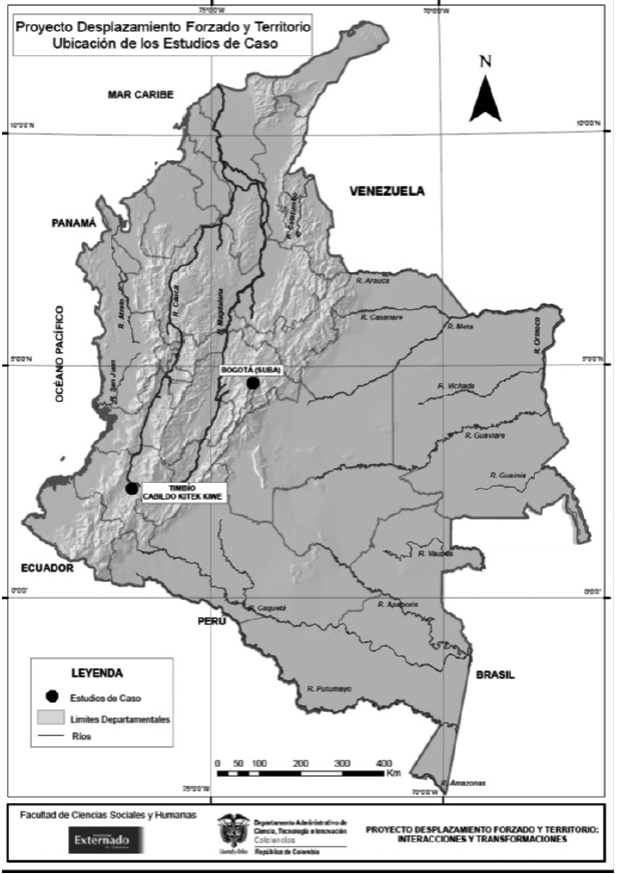 Este trabajo se enmarca dentro del desarrollo del Proyecto de investigación “Desplazamiento forzado y territorio: interacciones y transformaciones” financiado por la Universidad Externado de Colombia y el Departamento Administrativo de Ciencia y Tecnología, Colciencias. El equipo pluridisciplinario de investigadores del proyecto (psicología, geografía, antropología principalmente, pero también ciencia política y derecho) inició sus actividades formales en febrero del 2010. Además de los dos estudios de caso presentados en este artículo, el proyecto incluye otros dos: mujeres cabeza de familia reasentadas en la ciudad de Montería, en el Caribe colombiano, y campesinos reasentados en la ciudad de Cúcuta, ciudad fronteriza con Venezuela. El objetivo general planteado inicialmente en el proyecto buscaba tanto comprender las dimensiones material y simbólica de la relación de los desplazados establecen con sus nuevos territorios, como la percepción que los antiguos residentes en los territorios donde se reubican los desplazados respecto de las transformaciones del territorio inducidas por la llegada de las poblaciones que han sido desarraigadas del suyo propio.