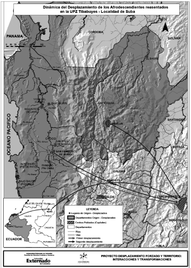 Los desplazados han perdido su lugar de residencia, sus actividades productivas tradicionales, su red de relaciones sociales de vecindad inmediata. Deben instalarse en lugares frecuentemente muy diferentes a los de origen y construir, rápidamente y en condiciones precarias, una relación con su nuevo territorio. Los sitios de reasentamiento no son por lo general lugares despoblados, lo que lleva a preguntarse también por los cambios sucedidos tras la llegada de los desplazados y la visión que los antiguos residentes tienen de estos cambios. Esta problemática se aborda para desplazados pertenecientes a dos comunidades étnicas1 diferentes: afrocolombianos provenientes en su mayoría de la región del Medio Atrato en el Departamento del Chocó, en el Pacífico colombiano, reasentados en el sector de Tibabuyes de la localidad bogotana de Suba, y campesinos-indígenas de la etnia Nasa provenientes del Alto Naya en el Departamento del Cauca, suroccidente colombiano, residentes actualmente en el predio rural denominado La Laguna, situado en el municipio de Timbío (Departamento del Cauca).