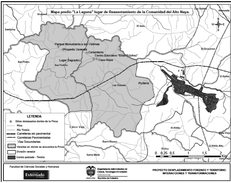 Este estudio de caso analiza el proceso de reasentamiento en la finca La Laguna, en el municipio de Timbío, en el Departamento del Cauca (ver mapa 4), de un grupo de familias campesino-indígenas14 desplazadas por la violencia de la región del Alto Naya, ubicada entre los Departamentos de Cauca y el Valle del Cauca (ver mapa 5). La masacre del Alto Naya, perpetrada por paramilitares durante la Semana Santa del 2001, es uno de los episodios del conflicto armado colombiano que ha recibido más atención tanto en Colombia, como fuera de ella.